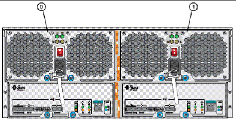 FIGURE 2 shows the location of power supplies 0 (left) and 1 (right) as viewed from the back of the disk tray. FIGURE 2 identifies the power supply components.