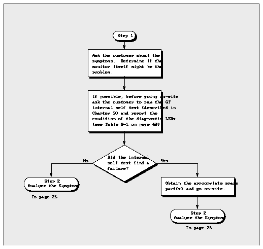 This chapter describes troubleshooting procedures for the GT Graphics Subsystem . The procedures described in this chapter have been written with the assumption that you have already isolated the problem to the GT Graphics Subsystem or at least to a display problem and not a CPU, software, or network problem.