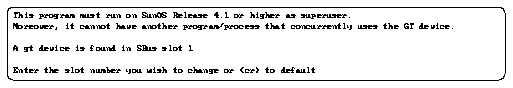 At start up, gtprobe prints all devices that are installed in each SBus slot (slots 1, 2, and 3). If gtprobe doesn't find a GT device, it will default to the first empty SBus slot.