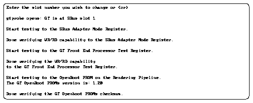 The gtprobe test is a standalone utility that checks for proper operation of the interface to the GT Graphics Subsystem. This test can be run from an attached auxiliary terminal, from a remote log in terminal, or from the system terminal.