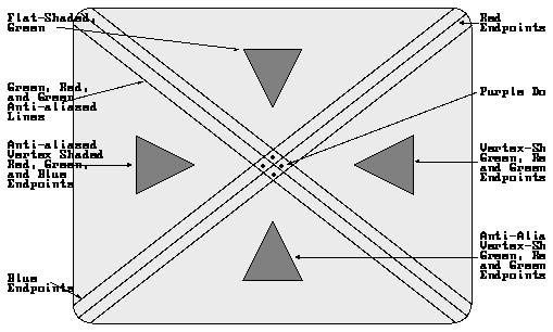Three anti-aliased lines run diagonally from the upper left to the lower right. The line in the middle is red, the other two are green, Three non-anti-aliased lines run diagonally from the top right to the bottom left. These lines are red at one end and blue at the other, with all the blending colors in between.