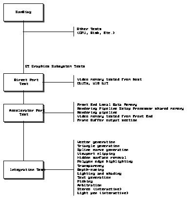 Figure 3-8 shows an overview of the SunDiag tests. The subtests are run in the order shown in the figure. The subtests assume that the GT Graphics Subsystem has an active working interface with the SPARCstation CPU. If for any reason SunDiag cannot make the connection, further testing is not possible and SunDiag will report a fatal unrecoverable error.