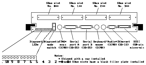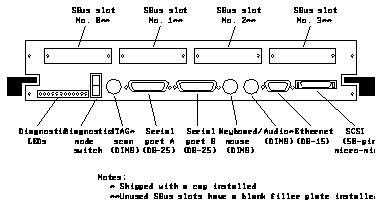 The setup parameters may differ from the setup at the customer site. These parameters can be changed in the NVRAM. See the sFigure 4-1 600MP System Board Back Panel Connectors