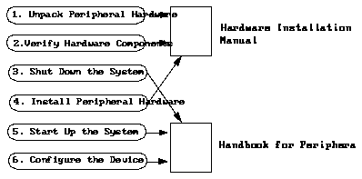 The diagram below outlines the tasks you can perform to successfully install a new peripheral. Each numbered item in the diagram represents a procedure and the arrows point to manuals in which these procedures are detailed.