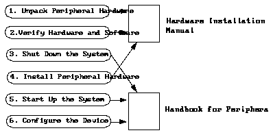The diagram below outlines the tasks you can perform to successfully install a new peripheral. Each numbered item in the diagram represents a procedure and the arrows point to the specific manual in which these procedures are detailed.