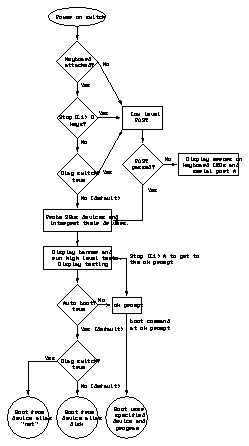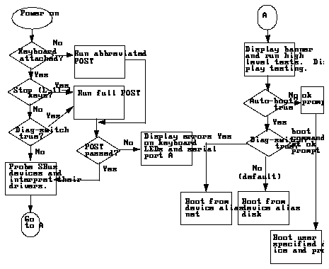 Figure 2-1 and Figure 2-2 outline the roles played by various diagnostics during the default boot mode. A description of the flowchart follows Figure 2-1 and Figure 2-2.