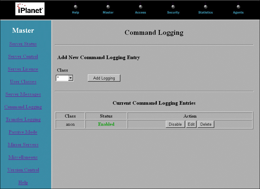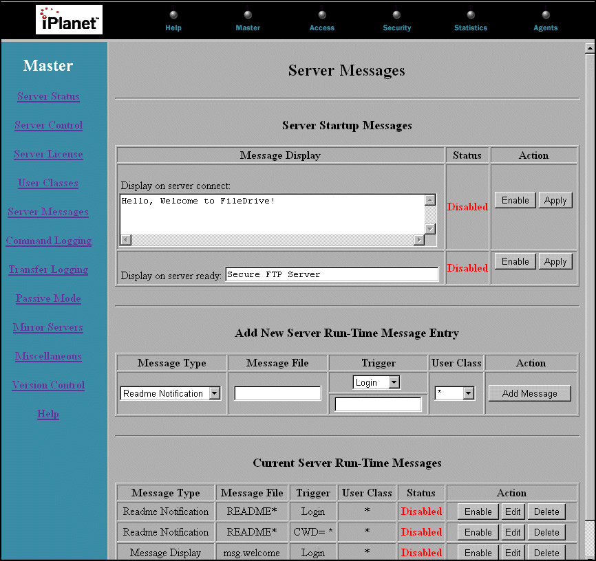This chapter covers the pages for viewing and changing the Master Server Controls. These pages, which are displayed by clicking the corresponding header in the left frame of the Master screen, include: