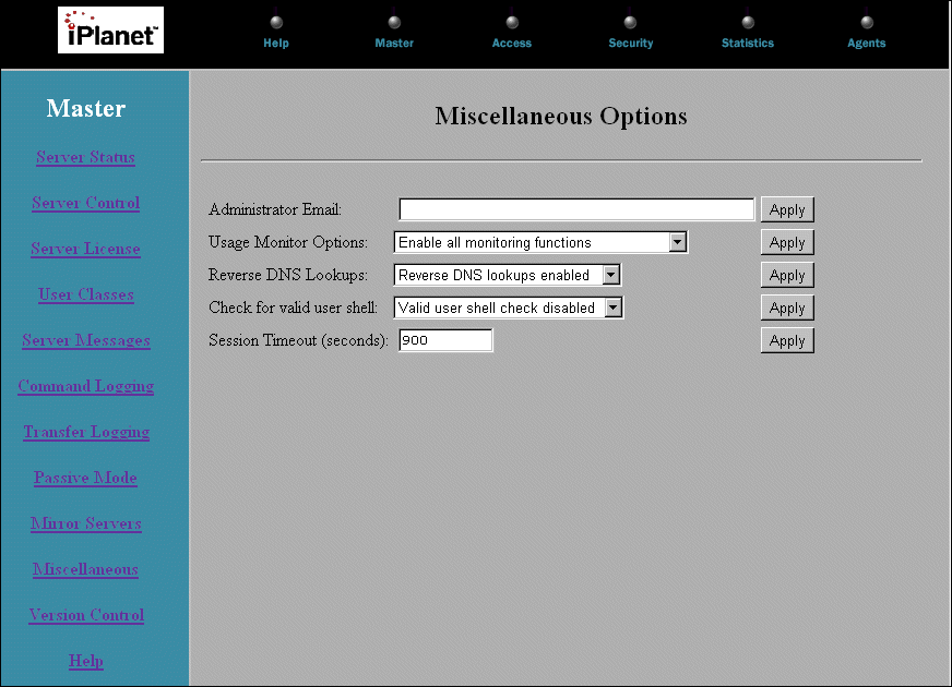 The Miscellaneous page is where you enter the administrator's email address, set usage monitor options, enable reverse DNS lookups and valid user shell checks, and set session timeout limits.