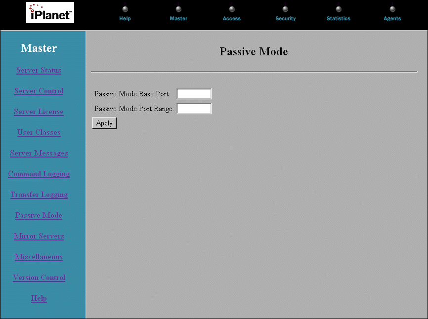 The Passive Mode page is where you specify a base port or a base port and range for passive mode.