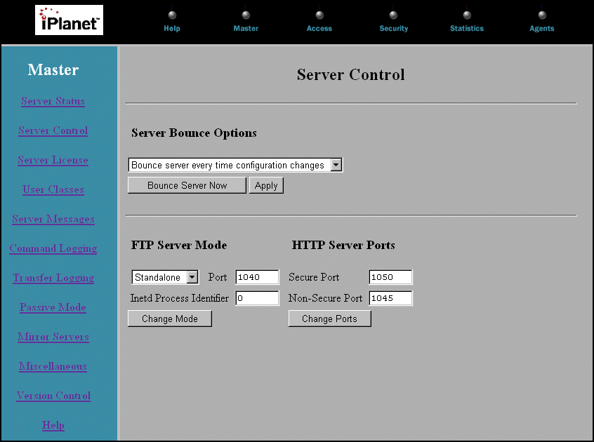 The Server Control page allows you to set the bounce options and select the mode of operation for the FTP Server.