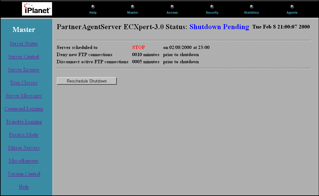 - The page displays the status of shutdown pending and the time that the Server will shut down. To return to the main Server Status page, click Reschedule Shutdown.