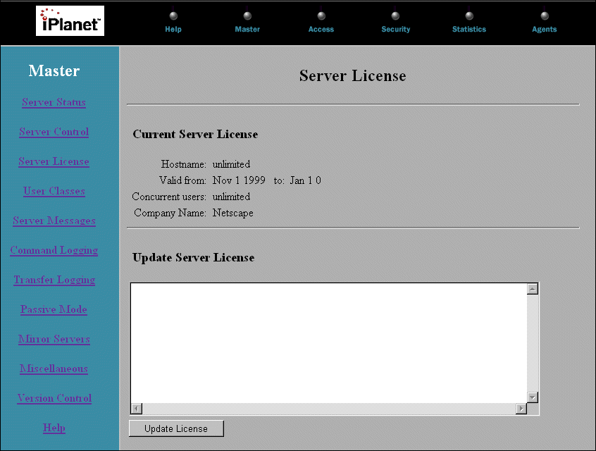 Contact iPlanet Technical Support to get a text file that contains a Server license.