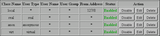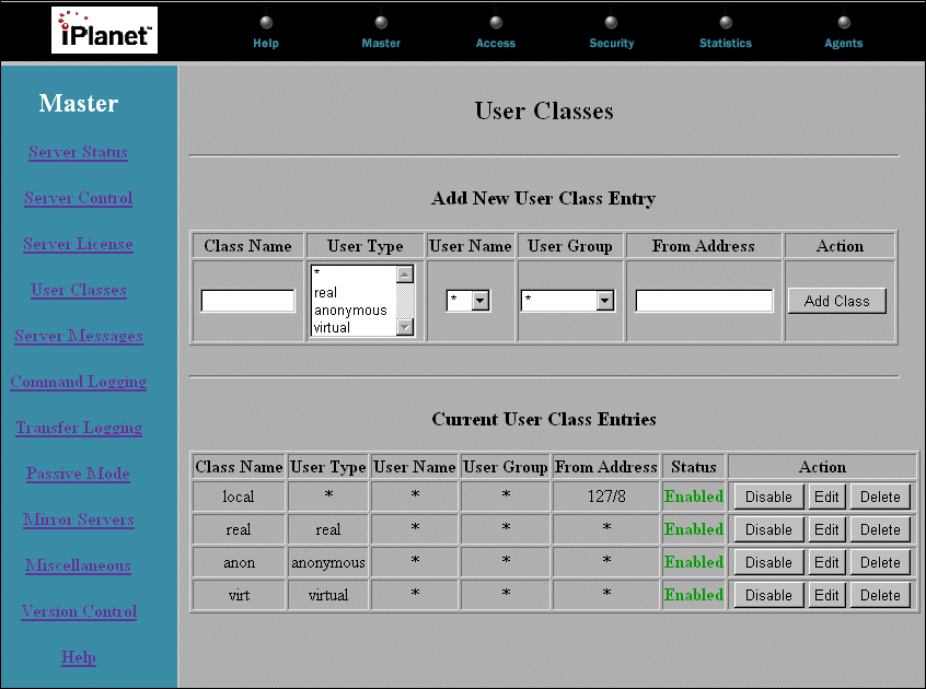 User Classes are the fundamental unit of access control in Partner Agent Server. A user class consists of a combination of user type, user name, user group, and address. The user type is either real, anonymous, or virtual (see User Types below). The user name is the user's UNIX login name. The user group is the user's UNIX group, and the address is the IP address or hostname to which this user class applies.