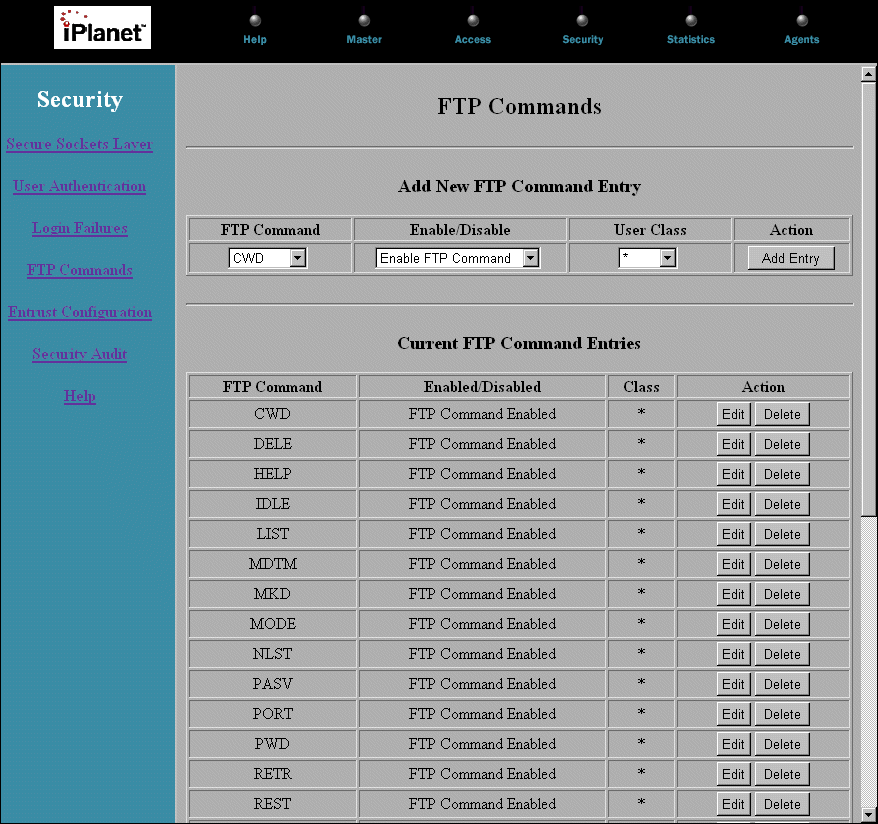 Figure 6-4    Security pages, FTP Commands screen ![]()