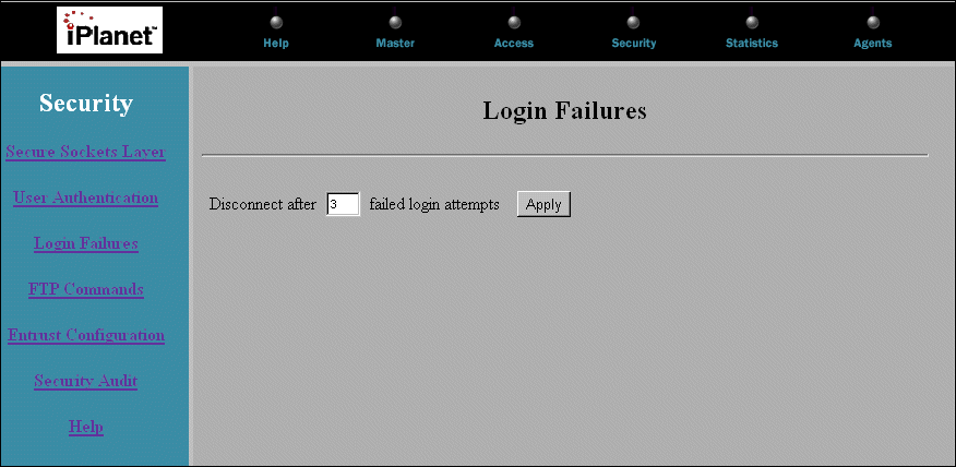 For security reasons, we recommended you limit the number of consecutive failed logins before the Partner Agent FTP Server terminates the connection with a user. If you do not limit this, a hacker could connect once and keep trying multiple passwords on a user's account. Set the failed login threshold at three attempts, for example, so users have to reconnect after every three failed attempts. The Login Failures page is where you can change the failed login threshold.