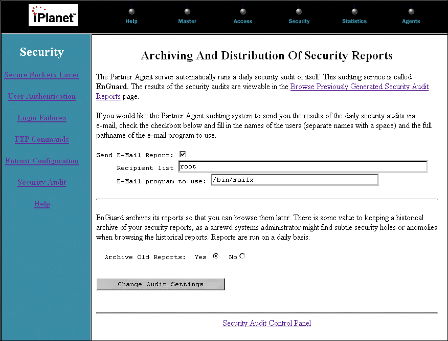 Figure 6-6    Security pages, Security Audit Control Panel, Archiving and Distribution of Security Reports screen ![]()