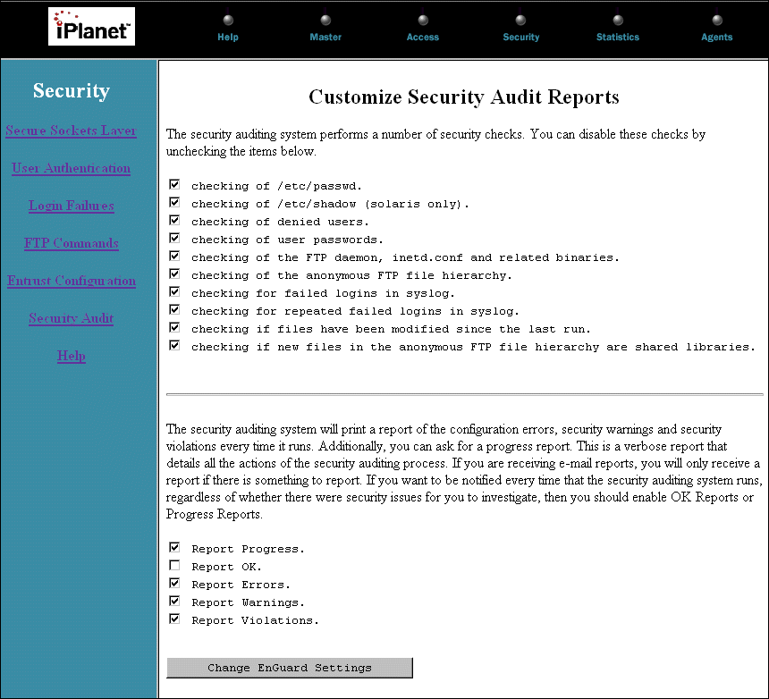 The Customize Security Audit Reports page is where you set which security checks are performed and what gets reported. To access this screen, from the Security Audit Control Panel page, click Customize Reports.