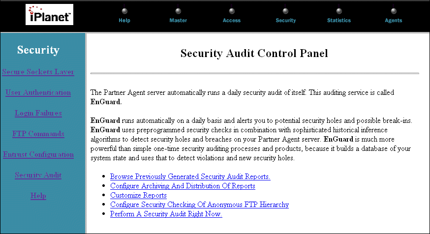 Your Partner Agent Server has an integrated security auditing system, called EnGuardTM, that can be enabled to automatically runs daily. EnGuard alerts you of potential security holes and possible break-ins. EnGuard uses pre-programmed security checks in combination with sophisticated historical inference algorithms to detect security weaknesses on your Server.