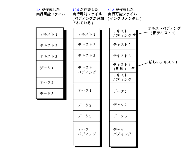 ildは、プログラムの構成要をいくつかに分散し、実行可能ファイルの各セクションにパディングを追加します。パディングによって、ldリンクを実行したときよりも、実行可能モジュールのサイズが大きくなります。インクリメンタルリンクを何度か繰り返すうちに、オブジェクトファイルのサイズは徐々に大きくなっていくので、パディングがすべて使用されてしまうことがあります。このような場合には、メッセージが表示され、実行可能ファイル全体に対して完全再リンクが行われます。たとえば、図 5-1 の 3 つの図は、それぞれリンク済み実行可能ファイルのテキストとデータの並びを示しています。左の図は、