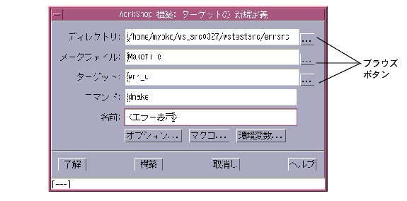2. 「メークファイル」フィールドに、使用するメークファイル名を入力します。3. 「ターゲット」フィールドに、使用する構築ターゲット名を入力します。4. 「コマンド」フィールドに、使用する構築コマンド名を入力します。