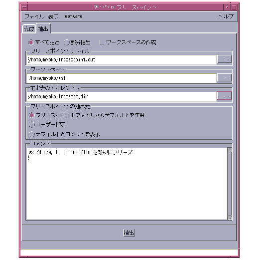 5. 凍結ファイルの SCCS 履歴を含むワークスペースを作成するには、「ワークスペースの作成」チェックボックスを選択します。6. 「フリーズポイントの抽出元」の 3 つのラジオボタンのいずれかを選択して、ソースワークスペースを指定します。