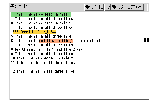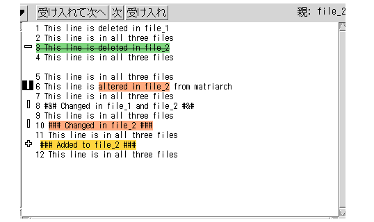 1 This line is deleted in file_12 This line is in all three files4 This line is in all three files5 This line is in all three files6 This line is altered in file_2 from matriarch7 This line is in all three files8 #&# Changed in file_1 and file_2 #	 This line is in all three files10 ### Changed in file_2 ###11 This line is in all three files### Added to file_2 ###12 This line is in all three filesこれらのファイルを自動マージすると、「ファイルマージ」ウィンドウの左上にマージ結果が表示されます。相違は 7 つで、そのうちの 6 つが解決され、1 つが未解決になります (図 6-5 を参照)。解決された相違には、白抜きのグリフが表示されます (図 6-6 と 図 6-7 を参照)。
