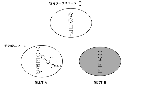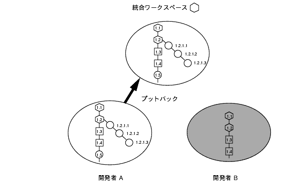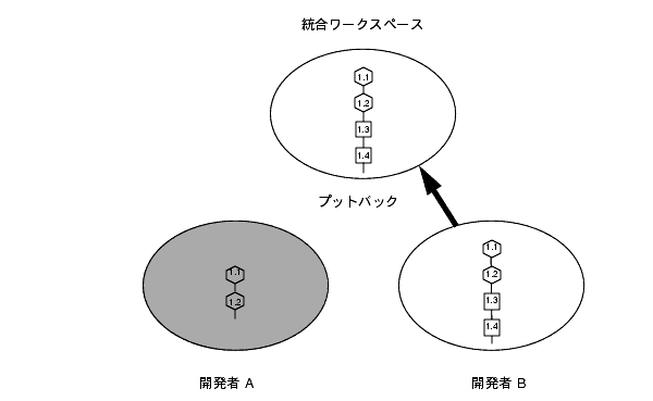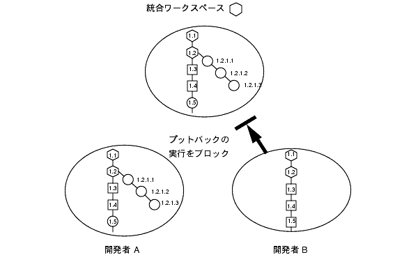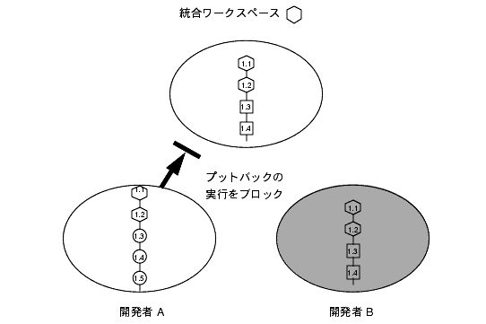 ファイルが衝突しているので 、ワークスペース管理ツールは、開発者 A のプットバックトランザクションの実行要求をブロック (拒否) します。もし、ここでプットバックトランザクションの実行を許可すると、開発者 B がプットバックした変更が失われてしまいます。開発者 A はプットバックの前に、開発者 B による変更内容を自分のファイルに取り込む必要があります。