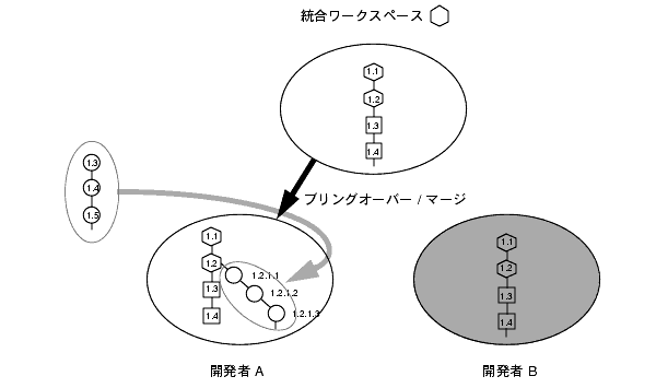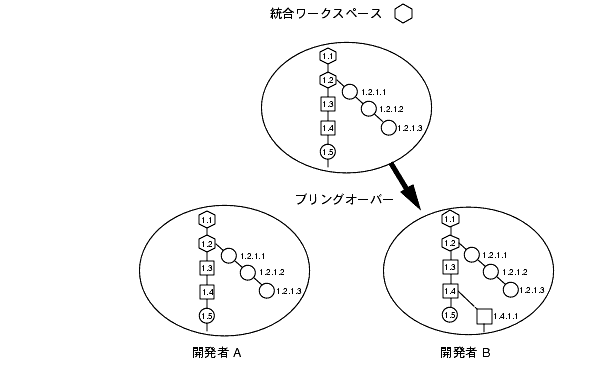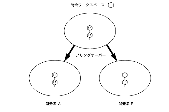 開発者 B は、開発者 A が統合ワークスペースに戻した変更されたファイルを自分のワークスペースにブリングオーバーします。ここで、このファイルのデルタは、ワークスペース管理ツールによって開発者 B のワークスペースの SCCS 履歴ファイルに追加され、番号が付けなおされます。
