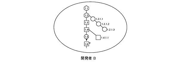 前述の例と同様に、ワークスペース管理ツールは、開発者 B が作成したデルタを、基幹デルタツリーの最新の共通デルタに分岐として追加し、それに応じて番号を付けなおします。1.5 が 1.4.1.1 になります。1.4.1.1 は、デフォルトのデルタのままです。衝突が解決される以前に開発者 B のワークスペースで新たに作成されたデルタはすべて、この分岐に追加されます。