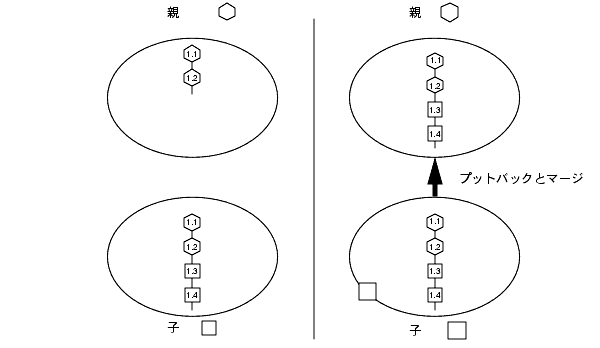 図 12-1 に、プットバックトランザクションで子ワークスペースのデルタ 1.3 と 1.4 を親ワークスペースの SCCS 履歴ファイルに追加する例を示します。