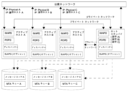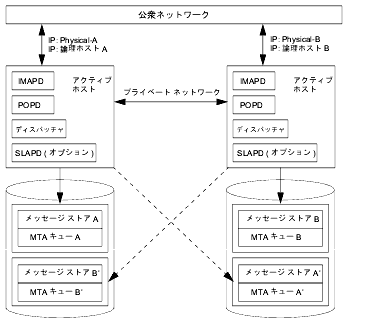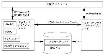 基本非対称または「ホット スタンバイ」高可用性モデルは、2 台のクラスタ化ホスト マシンまたは「ノード」で構成されます。 論理 IP アドレスおよび関連ホスト名は両方のノードに指定されます。このモデルでは、指定時に 1 つのノードのみがアクティブになります。バックアップまたはホット スタンバイ ノードはほとんどの間アイドル状態のままになります。 両方のノード間の単一の共用ディスク アレイは、構成されアクティブまたは「プライマリ」ノードに指定されます。 単一メッセージ ストアおよび Mail Transport Agent (MTA) キューは、この共用ボリュームに常駐します。 また、アクティブ ノード上では 1 つのメール サービス インスタンスのみ実行します。