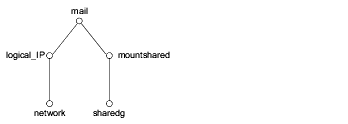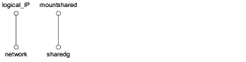 次の手順で、依存性ツリーを開始します。 logical_IP リソースは network リソースに依存し、mountshared リソースは sharedg リソースに依存します。 依存性ツリーは次のようになります。
