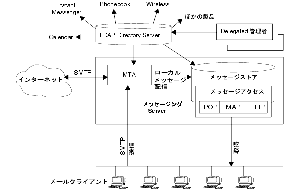 Messaging Server は、メッセージストアを介して、一貫性のあるメッセージングサービスを提供します。メッセージストアには、HTTP、POP、および IMAP プロトコルを介してアクセスできます。Message Access コンポーネントは、メッセージストアからのメッセージの取得を担当します。