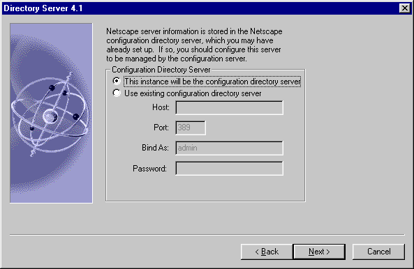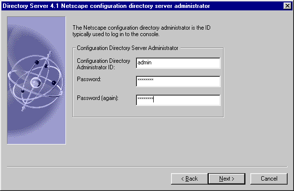 - ここには、Netscape Console を使用してサーバ設定を変更するときに必要なユーザ ID (デフォルトは admin) およびパスワードを指定します。 Configuration Server 管理者は、Configuration Directory Server インスタンスを使用するすべてのサーバに対する管理権限を保持しています。ただし、Configuration Directory Server 自体に対する管理権限は保持していません。 サーバ管理は、指定したホストからサーバにアクセスするユーザだけに制限されます。 Netscape Console を開くと、Directory Server 管理者のユーザ ID およびパスワードの入力が求められます。