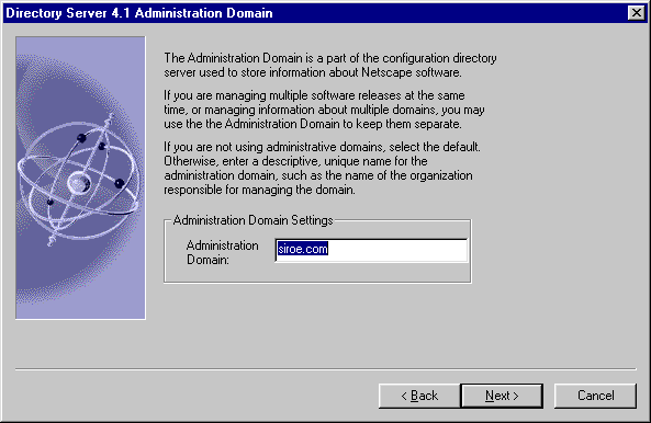 - サーバ構成情報を保管する Configuration Server Directory の管理ドメインを指定します。 ここには、組織のドメインを入力します (例 : siroe.com)。 Configuration Directory Server に指定したものと同じドメイン名を使用する必要があります。 この質問は、既存の Configuration Directory Server が存在せず、Messaging Server に含まれる Configuration Directory Server をインストールする場合に表示されます。