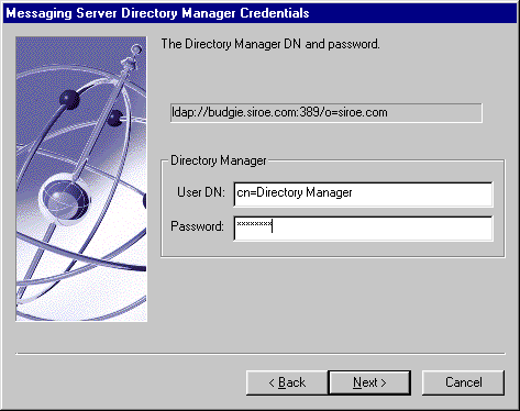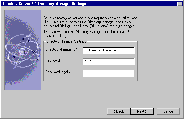 - ディレクトリサーバ操作の中には、管理ユーザだけが実行できるものがあります。 このユーザは、Directory Manager と呼ばれ、通常 cn=Directory Manager のバインド識別名 (DN) を保持します。 ここでは、Directory Manager の識別名およびパスワードを指定します。