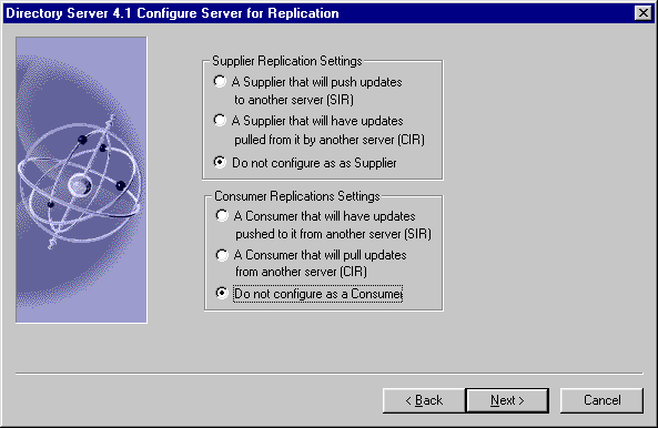 注 ここで Directory Server を Supplier (サプライヤ) および Comsumer (コンシューマ) として構成しなかった場合は、後で構成できます。詳細は、Directory Server のマニュアルを参照してください。