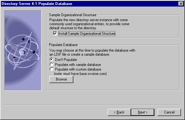 - LDIF ファイルを使ってデータベースを生成するか、サンプルデータベースを作成してデータベースを生成するかを選択できます。 既存の LDIF ファイルからエントリをインポートする場合は、[Populate with custom database button] を選択してから [Browse] をクリックし、適切な LDIF ファイルを検索および選択します。