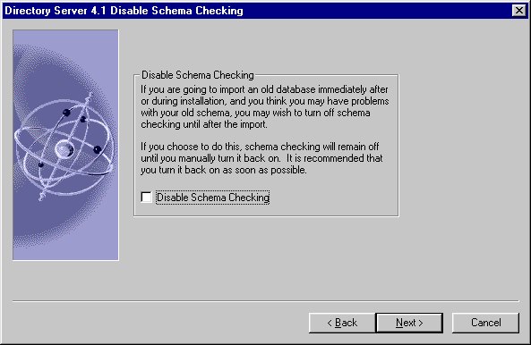 - インストール中またはインストール後に、旧バージョンの Directory Server データベースをインポートする場合、インポートが完了するまでスキーマ検査を無効にできます。 スキーマ検査は、いったん無効にすると、手動で有効に設定するまで無効のままになります。 スキーマ検査は、できる限り早く有効に戻すことをお勧めします。
