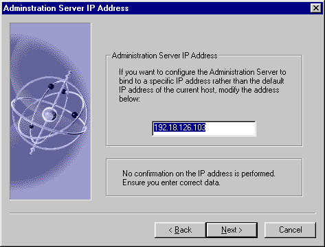 - Administration Server を、現在のホストのデフォルト IP アドレスではなく、特定の IP アドレスにバインドできます。 ホストマシンが複数の IP アドレスを保持している場合、Administration Server が使用するアドレスを指定できます。 現在のホストのデフォルト IP アドレスが、次の例のように表示されます。