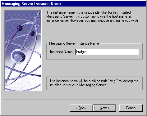 - これは、Messaging Server インスタンスの一意の識別子です。各 Messaging Server インスタンスには、「サーバ ID」と呼ばれる一意の識別子を指定する必要があります。 インストールプログラムは、指定された名前に自動的に接頭辞「msg-」を追加します。 たとえば、サーバインスタンスに budgie という名前を付けると、インストールプログラムは msg-budgie というサーバ IDを作成します。