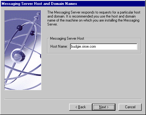 - これは、Messaging Server が置かれており、そこで Messaging Server によってコマンドが実行されるマシンのホストおよびドメインの名前です。 これは、hostname.domainname という形式で指定します (例 : budgie.siroe.com)。