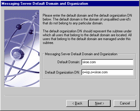 - この Messaging Server のドメインおよび組織を指定します。 デフォルトドメインは、特定のドメインに属さない未修飾のユーザ ID のドメインです。 デフォルトの組織 DN は、デフォルトドメインに属するすべてのユーザが置かれているサブツリーを表現します。 デフォルトドメインに属するすべてのユーザは、このサブツリー内で管理されます。