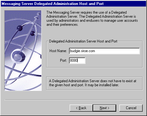 - iPlanet Messaging Server は、Delegated Administration Server と共に使用する必要があります。 管理者およびエンドユーザは、このアプリケーションを使用して、ユーザアカウントおよびその詳細設定を管理できます。 ホスト名は、Delegated Administrator 用の Web サーバを配置するマシンの名前にする必要があります。このマシンは、ローカルでも、リモートでもかまいません。 ポート番号には、Web サーバが待機するポートを指定します。 デフォルトのポート番号は、8080 です。