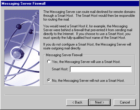 - ファイアウォール配下で Messaging Server を動作させる場合、ファイアウォール越しにメッセージの経路指定を行う機能を持つ Smart Host のホスト名を、完全修飾の書式で指定する必要があります。 Messaging Server がメール受信者のアドレスまでの経路を指定できない場合、Messaging Server は、そのメッセージを Smart Host に転送します。