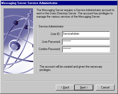 - 新規の Directory Server を使用して iPlanet Messaging Server をインストールする場合は、次の情報を入力する必要があります。