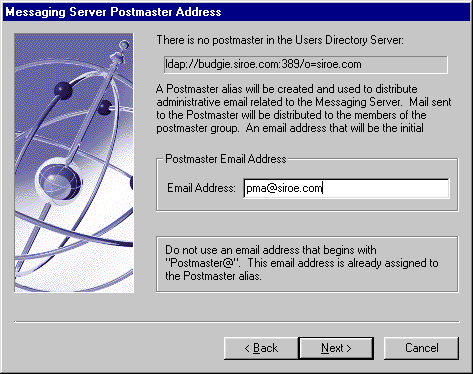 - ポストマスターグループ (電子メールのグループアドレスなど) は、インストールプログラムにより作成されます。ここでは、ポストマスターグループのメンバーの電子メールアドレスを指定するよう求められます。 Users and Groups Directory Server のポストマスター宛てのメールはすべて、この電子メールアカウントに送信されます。
