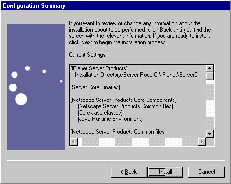 - 最後のインストール画面では、インストールおよび構成パラメータの要約が表示されます。画面には、必要に応じて前の画面に戻り、パラメータを変更することができるという旨のメッセージが表示されています。ただし、戻ることができるのは、[Messaging Server Default Domain and Organization] 画面までです。 インストールパラメータの設定が完了したら、[Install] ボタンをクリックして、インストール処理を開始します。 imsimta dirsync コマンドが実行されるまで、インストール中に作成されたメールエイリアスは認識されません。 imsimta dirsync の詳細は、『iPlanet Messaging Server 5.1 リファレンスマニュアル』を参照してください。 インストール処理が完了したら、iPlanet Messaging Server およびそのコンポーネントを使用する前に、システムをリブートすることをお勧めします。