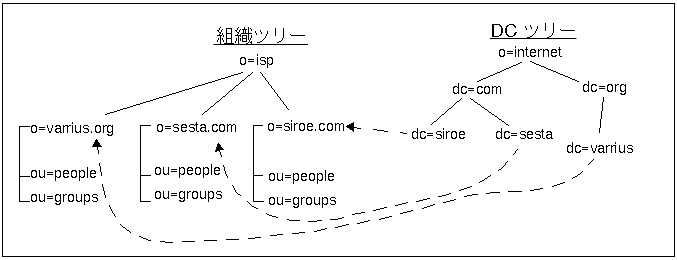 サブドメイン用の個別のネームスペースを持つことができる。たとえば、west.siroe.com と siroe.com は、別々の組織サブツリーにマップされます。これにより、各サブツリー内に同じ UID を持つユーザエントリを作成できる