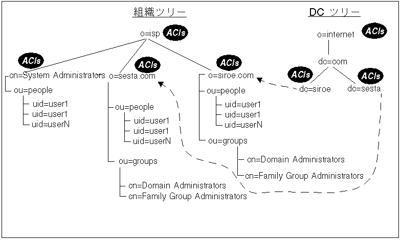 dc=sesta, dc=com, o=internet図 1-4 に、ドメインとルートエントリノード用にインストールされる ACI を示します。